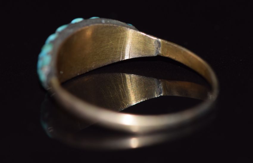 Victorian yellow metal ring set with turquoise cabochons,1.9g, size P/Q