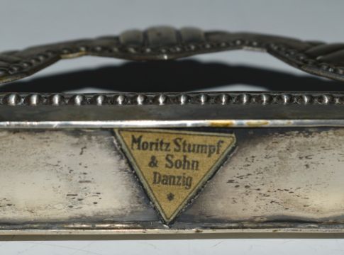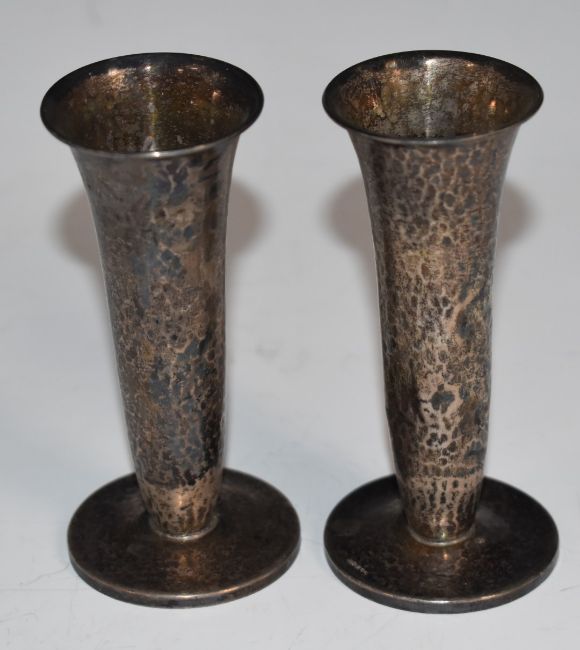 Pair of German silver vases with hammered decoration, marked 835, German letter rack with 800 grade silver marks and label for Moritz Stumpf & Sohn Danzig, length 15cm, weight of all three 158g, together with an unmarked twin handled tray/bowl