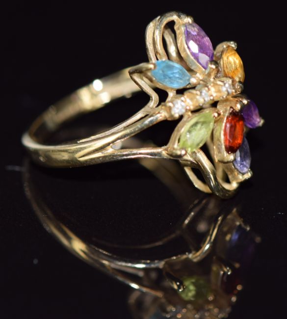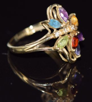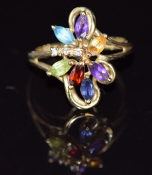 A 9ct gold ring set with amethyst, peridot, tanzanite, citrine, topaz and diamonds, 2.9g, size M/N