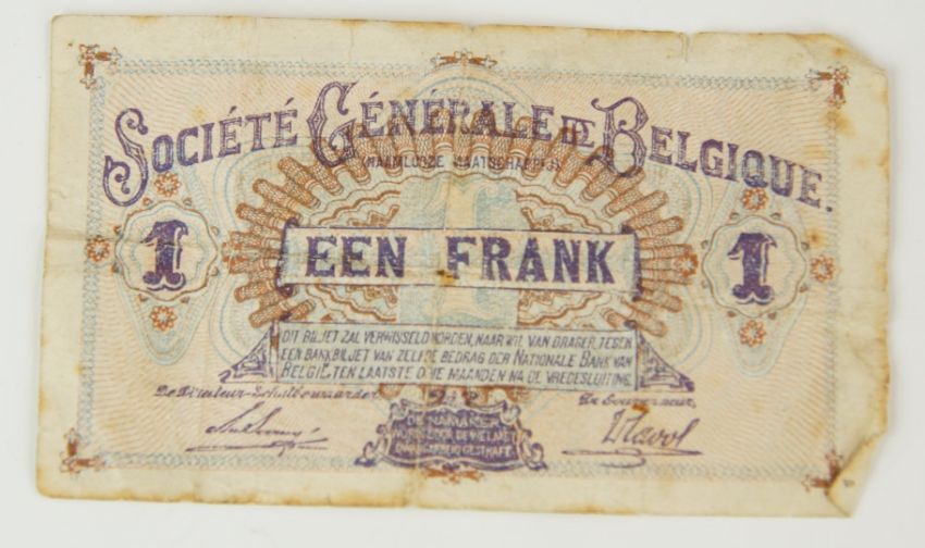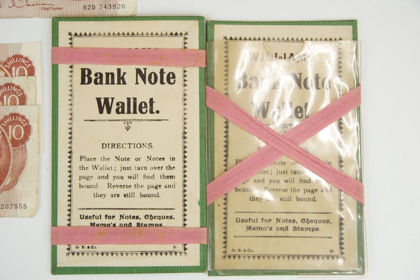 George IV 1821 crown and three silver threepence coins, together with a J B page blue £5 banknote, four 10 shilling notes Hollom and Fforde and a Belgian 1 franc wartime 1916 note