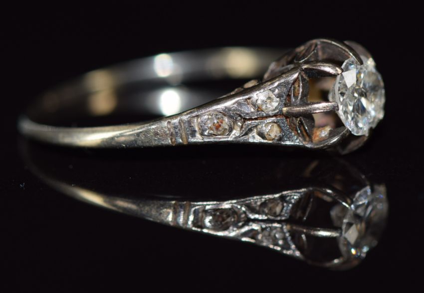 A c1930 platinum ring set with a diamond of approximately 0.3ct with diamond encrusted shoulders, 1.5g, size N