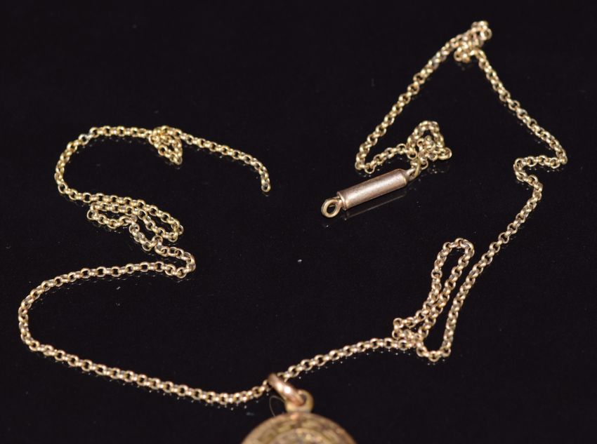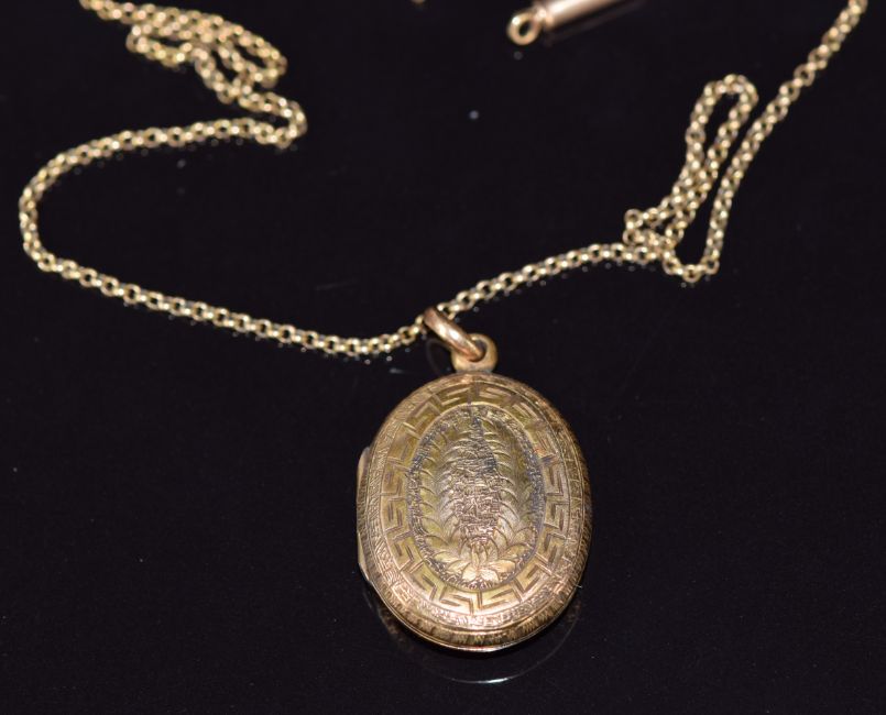 Victorian locket with fern, Greek key and shield decoration, 2.4 x 1.8cm, on 9ct gold chain, 3.4g