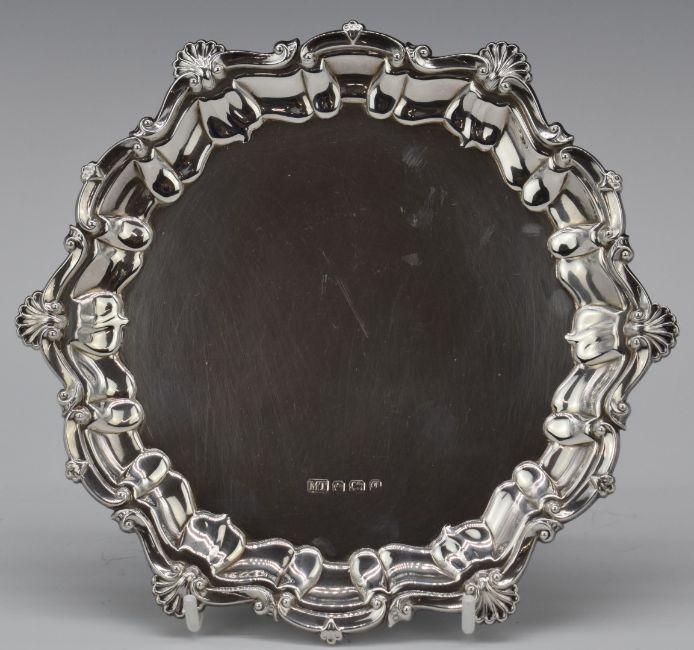 Elizabeth II hallmarked silver tray with shaped edge, Sheffield 1973, makers mark MT, diameter 19.5cm, weight 281g