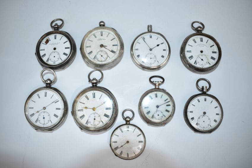 Nine hallmarked and other silver open faced pocket watches including Waltham, J G Graves of Sheffield, John Myers & Co, etc, each with Roman numerals and white dial, largest case diameter 54mm.