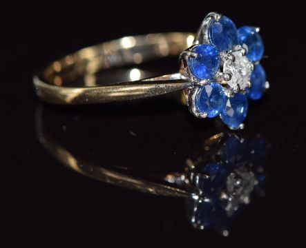 A 9ct gold ring set with a round cut diamond surrounded by sapphires, 2.7g, size P