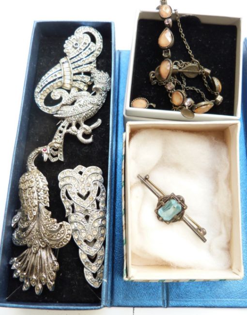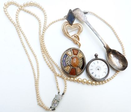 A collection of costume jewellery including Miracle brooch, Trifari brooch, silver ring set with butterfly wing, silver fob watch, silver chains, faux pearls, silver spoon etc
