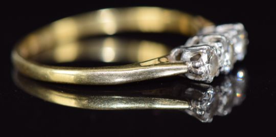 An 18ct gold ring set with three diamonds, the centre diamond of approximately 0.2ct, 2.6g, size T
