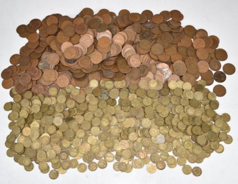 Approximately 11.2kg of bronze UK pennies and brass threepenny coinage