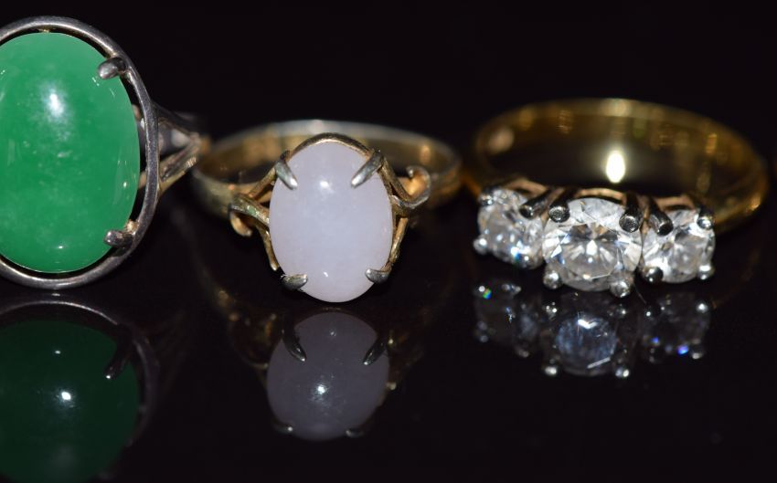 A white metal ring set with a jadeite cabochon, a Chinese silver ring set with lavender jade and three silver rings set with sapphires, cubic zirconia and quartz