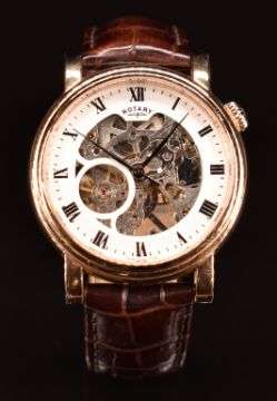Rotary gentleman's wristwatch ref. GS02843/02 with skeleton dial, black hands and Roman numerals, rose gold case and unsigned movement, on brown leather strap, case diameter 40mm, serial number PLO:008734, in original box with guarantee card and paperwork.