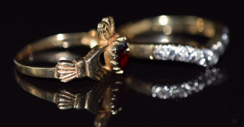 A 9ct gold Claddagh ring set with a heart cut garnet and a 9ct gold ring set with diamonds, 3.8g, sizes H & K