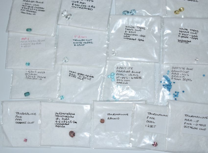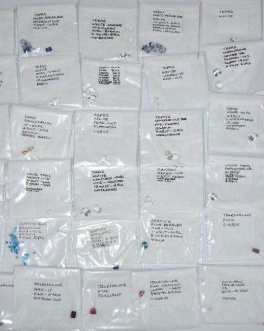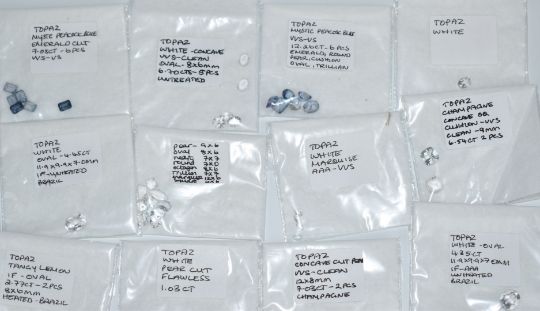 Approximately one hundred and forty three loose gemstones comprising sixty four loose white and blue topaz including blue 5.4ct fancy cut and 4.3ct oval cut, seventy loose apatites including 1.4ct oval cut, 1.3ct cushion cut and 1.5ct emerald cut and nine loose pink tourmalines including 1.28ct oval cut, 0.9ct emerald cut, 1ct trilliant cut etc