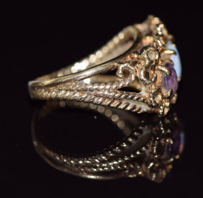 A 9ct gold ring set with garnets and an opal in a rope twist setting, 4.7g, size L