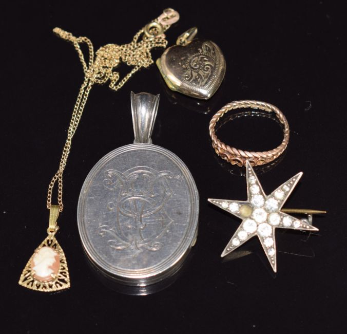 Victorian silver locket, paste brooch, 9ct rolled gold locket, 9ct gold chain and 9ct gold ring, 2.5g