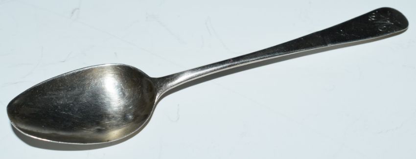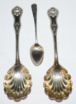 Pair of hallmarked silver serving spoons with shell shaped bowls, import marks for Glasgow 1897, maker George Edward & Sons, length 18cm, together with a Georgian hallmarked silver teaspoon, weight of all three 105g