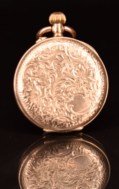 Unnamed 9ct gold keyless winding open faced pocket watch with Roman numerals, blued hands, engraved gold dial and unsigned movement, case diameter 29mm, serial number 1388, 19.9g.