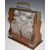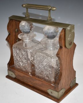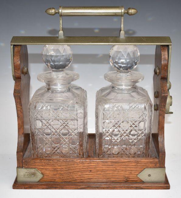Betjemann's patent oak two bottle tantalus, with cut glass decanters, W27 x H30cm