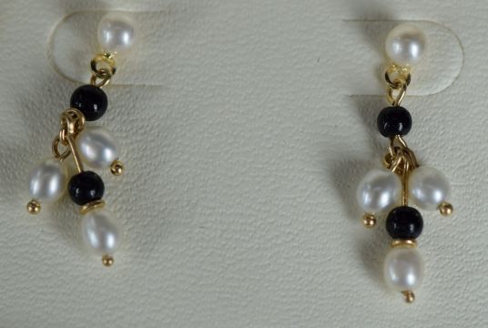 A pair of 14k gold earrings set with pearls and onyx, in original Macy's box