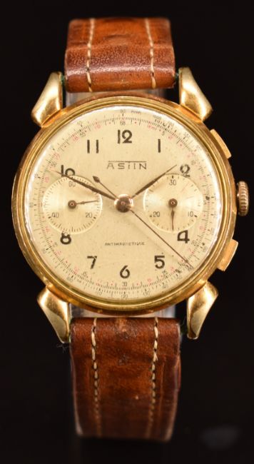 Astin gentleman's chronograph wristwatch with gold hands and Arabic numerals, silver dial, gold plated case and unsigned movement, on brown leather strap, case diameter 35mm, serial number 627105.