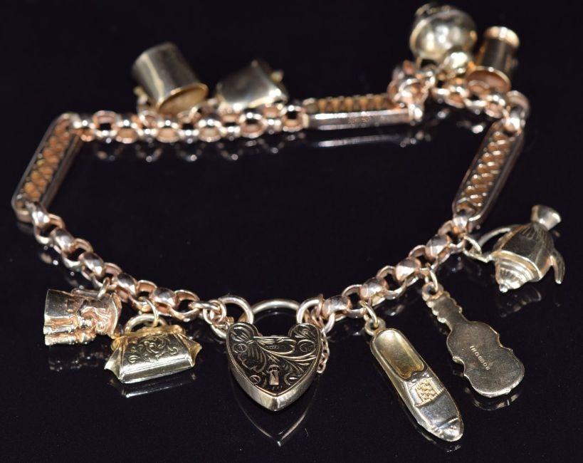 Victorian 9ct gold charm bracelet made up of faceted links with nine 9ct gold charms and heart padlock clasp, 16.7g, 18cm long