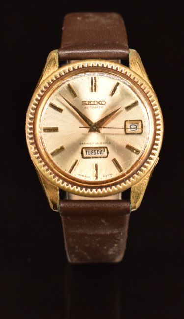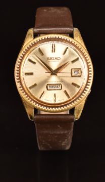 Seiko gentleman's automatic wristwatch ref. 6206-8110 with day and date apertures, gold dauphine hands, bevelled hour markers, champagne dial, gold plated case and signed Diashock 26 jewel calibre 6206 movement, on brown leather strap, case diameter 37mm, serial number 7620987, in original box with outer card sleeve.