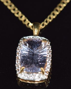 A 9ct gold pendant set with morganite and topaz on 9ct gold chain, pendant 2.4cm and chain 44cm, 5.8g