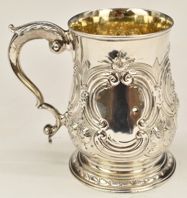 Georgian hallmarked silver pint tankard with embossed decoration and scrolling handle, London 1771, maker's mark rubbed but likely John Kidder, height 13cm, weight 388g