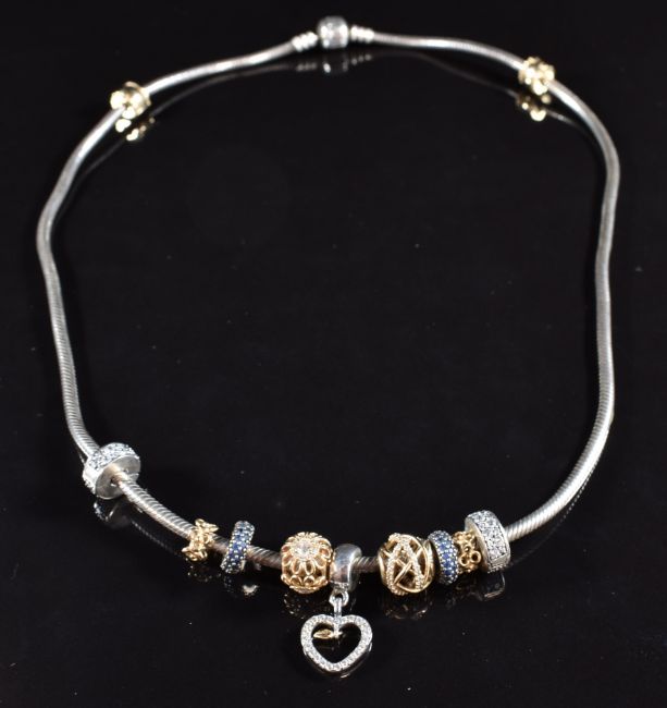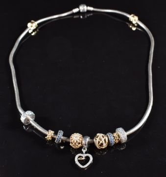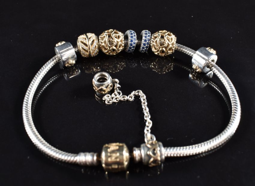 Pandora silver necklace with six 14ct gold beads/ spacers and five silver beads together with a similar bracelet with four 14ct gold beads/ clasp and five beads/ spacers and three additional silver charms