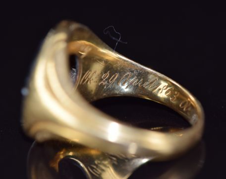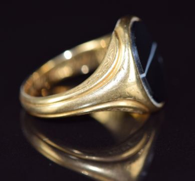 Victorian 18ct gold signet ring set with banded agate and engraved to inner band 'In memory Elizabeth Hall obt 29th April 1863 59 years', London 1863, 6.9g, size P