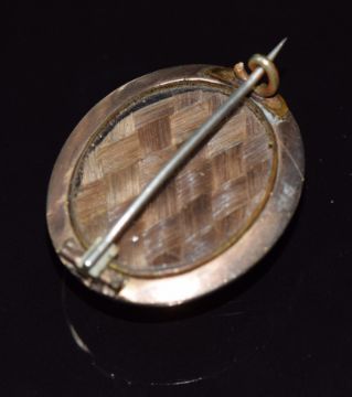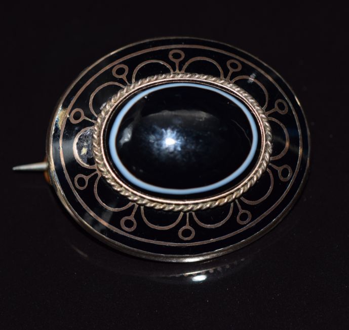 Victorian mourning brooch set with a banded agate cabochon, enamel and verso plaited hair, 10.7g, 3cm