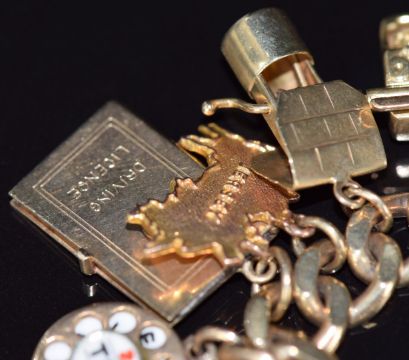 A 9ct gold charm bracelet with twenty two 9ct gold charms including telephone '2 tel U I love you', police hat, boat, car, football, etc, 63.2g, 17.5cm long