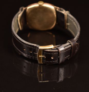 Smiths De Luxe 9ct gold gentleman's wristwatch with inset subsidiary seconds dial, gold hands and Arabic numerals, champagne dial and 15 jewel movement, on black leather strap, case diameter 31mm, serial number C159353.