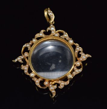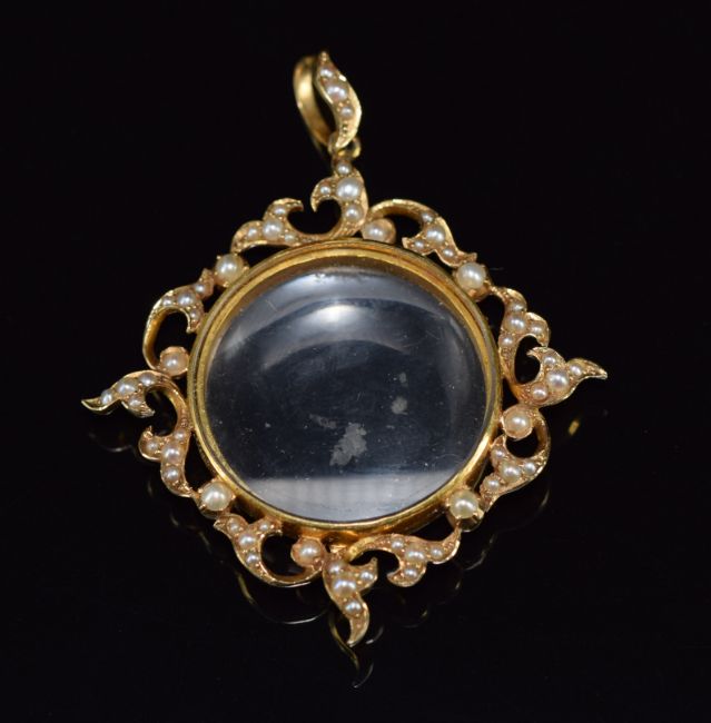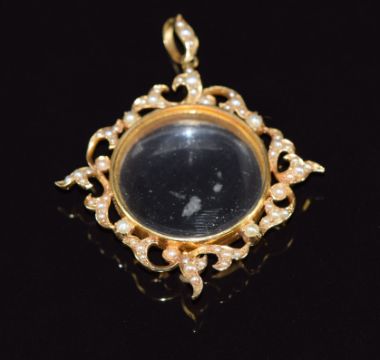 Edwardian 15ct gold locket set with a border of seed pearls, 11.4g, 4 x 3cm