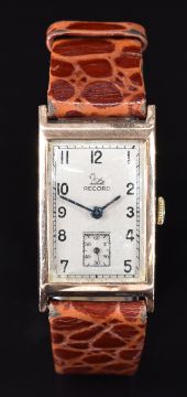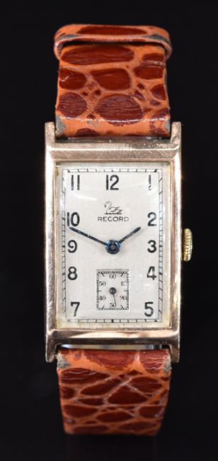 Record 9ct gold gentleman's wristwatch with inset subsidiary seconds dial, blued hands, Arabic numeral, silver dial, rectangular case and signed 15 jewel movement, on brown leather strap, case width 22mm, serial number 985083.