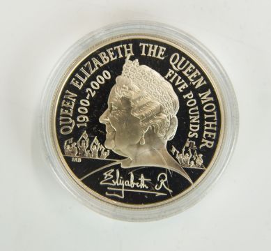 Royal Mint Queen Mother Centenary silver crown, together with a 2010 Restoration of the Monarchy commemorative medal coin, toned, 65mm 155.5g, in case with certificate 007 and a further toned silver cased commemorative crown sized coin