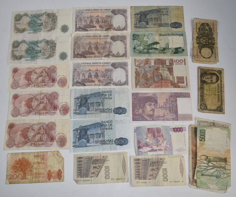 A quantity of world banknotes, largely pre Euro holiday change, together with clean UK examples