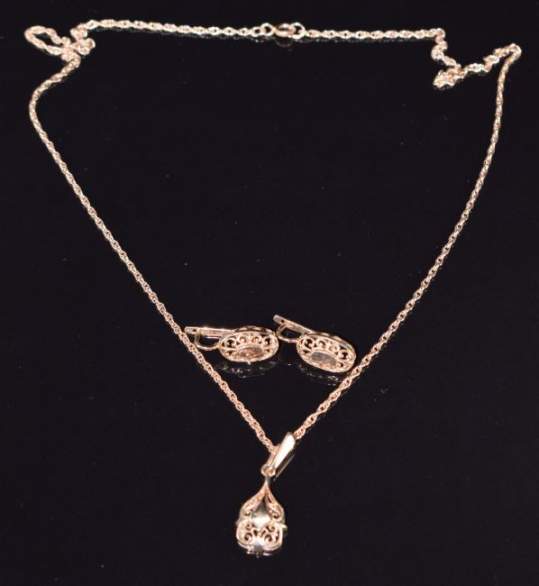 A 14ct rose gold necklace (52cm), pendant (2.5cm) and earrings (1.4cm) with pierced detail, 10.9g