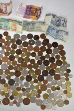 A collection of overseas coinage, largely holiday change, 1922 onwards, some banknotes, together with sundry UK coinage, including 'poor' George II halfpenny