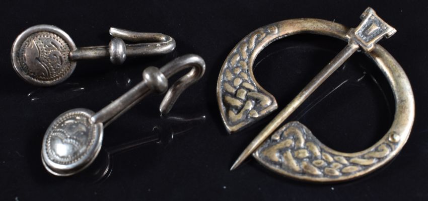 Three Scottish silver brooches/ pins, silver gilt brooch with enamelled Canadian leaf, and two napkin holders, Chester 1916