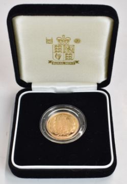 Queen Elizabeth II 2002 gold full sovereign, shield and wreath reverse, in Royal Mint case