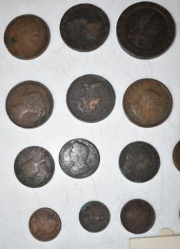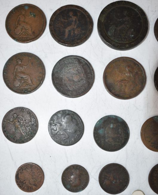 A collection of twenty two UK copper coins, Charles II onwards, includes provincial tokens, George III cartwheel etc, latest being Queen Victoria 1862 penny
