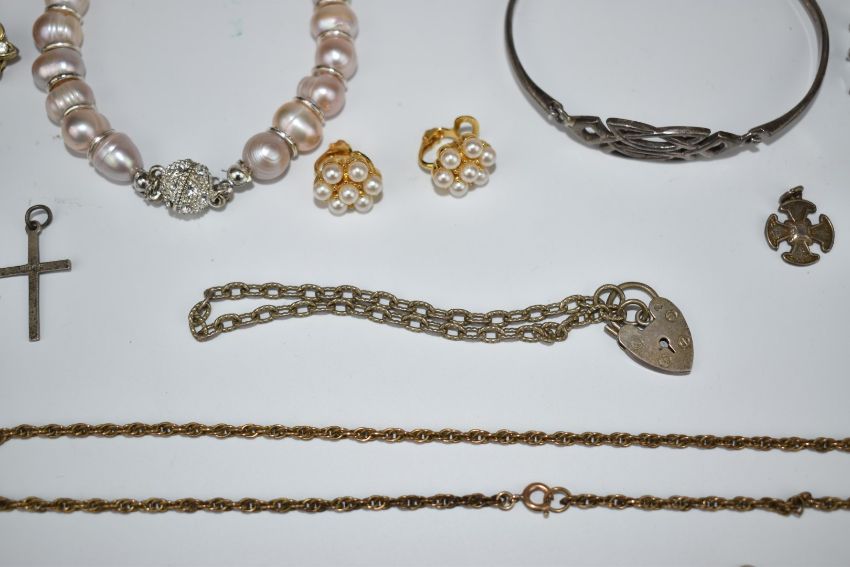 A collection of silver jewellery including two bangles, locket, necklaces, silver bracelets and a pearl necklace, etc