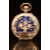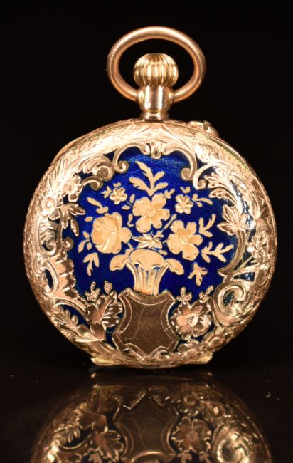 Unsigned 14ct gold keyless winding open faced pocket watch with blue enamel case back blued hands, Arabic numerals, cream dial and unsigned movement, case diameter 30mm, serial number 180029, 23g.
