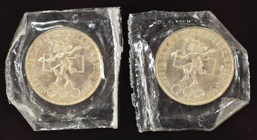 Two 1968 silver Mexico Olympic 25 pesos coins