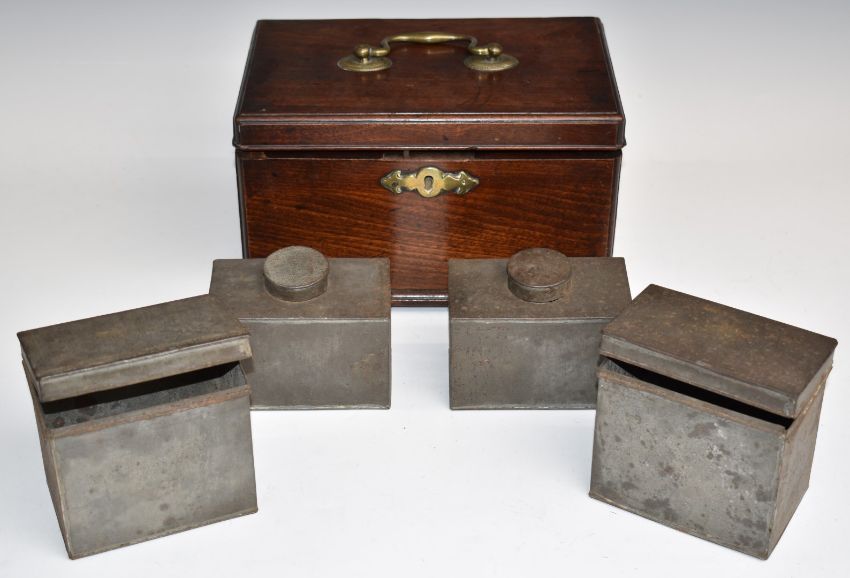 Georgian oak four division tea caddy raised on bracket feet with brass suspension handle, W28 x D18 x H16.5cm