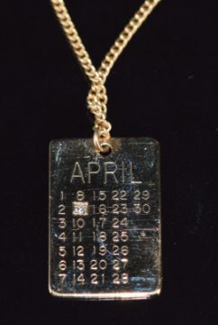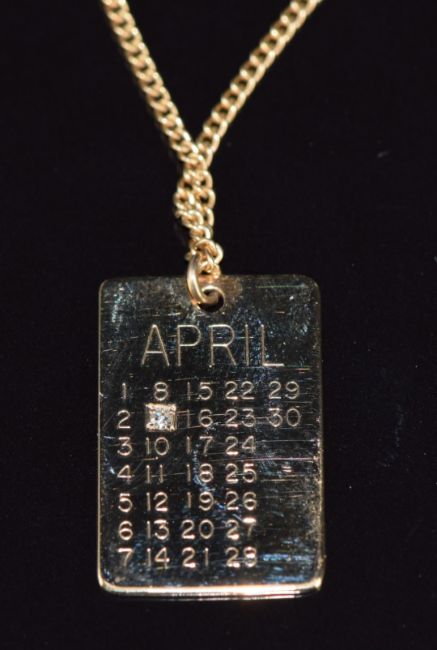 A 9ct gold calendar pendant set with a diamond over April 9th on yellow metal chain, pendant 2.4cm and chain 50cm long, 6.2g