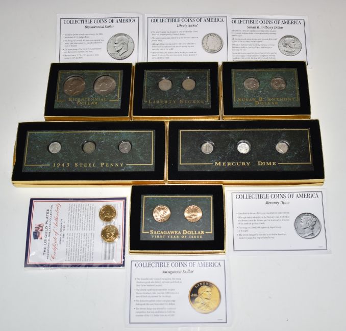 Westminster Coins 'Collectible Coins of America' sets to include Bicentennial Dollars, Liberty Nickel, Susan B Anthony Dollar, Sacagawea Dollar, President J F Kennedy gold plated dollars, Mercury Dimes and 1943 steel pennies, all cased, most with certificates