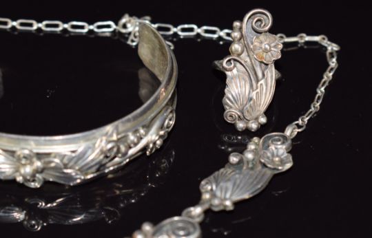 A suite of silver Navajo jewellery comprising bangle, necklace, ring and earrings