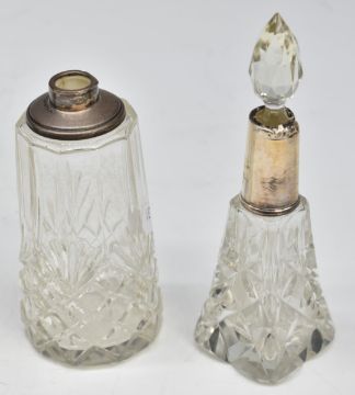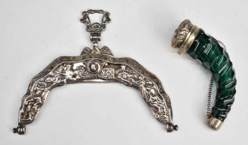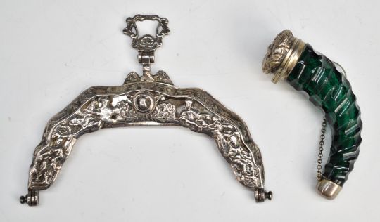 Various hallmarked silver topped and mounted cut glass bottles, hallmarked silver Berthold Muller bag mount, width 12.5cm, weight 92g, hallmarked silver mounted travelling clock, small trumpet shaped cut green glass scent bottle with unmarked silver gilt mounts