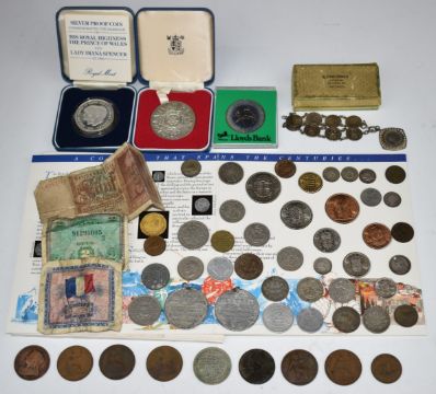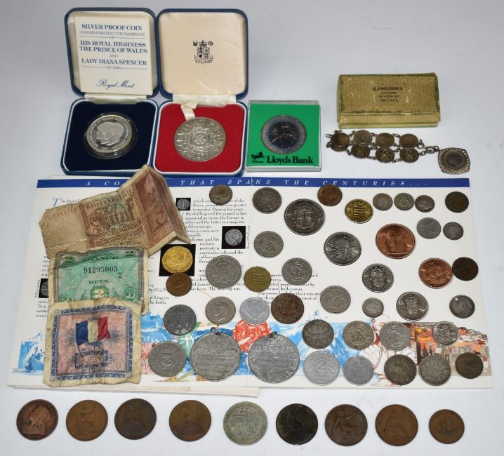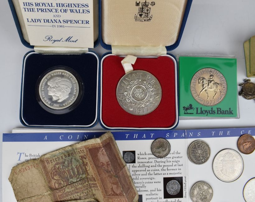Royal Mint cased Charles and Diana silver crown, Silver Jubilee medallion, together with a Libra 1967 Solidus Denarius set, together with sundry coinage with silver content, threepenny piece bracelet etc